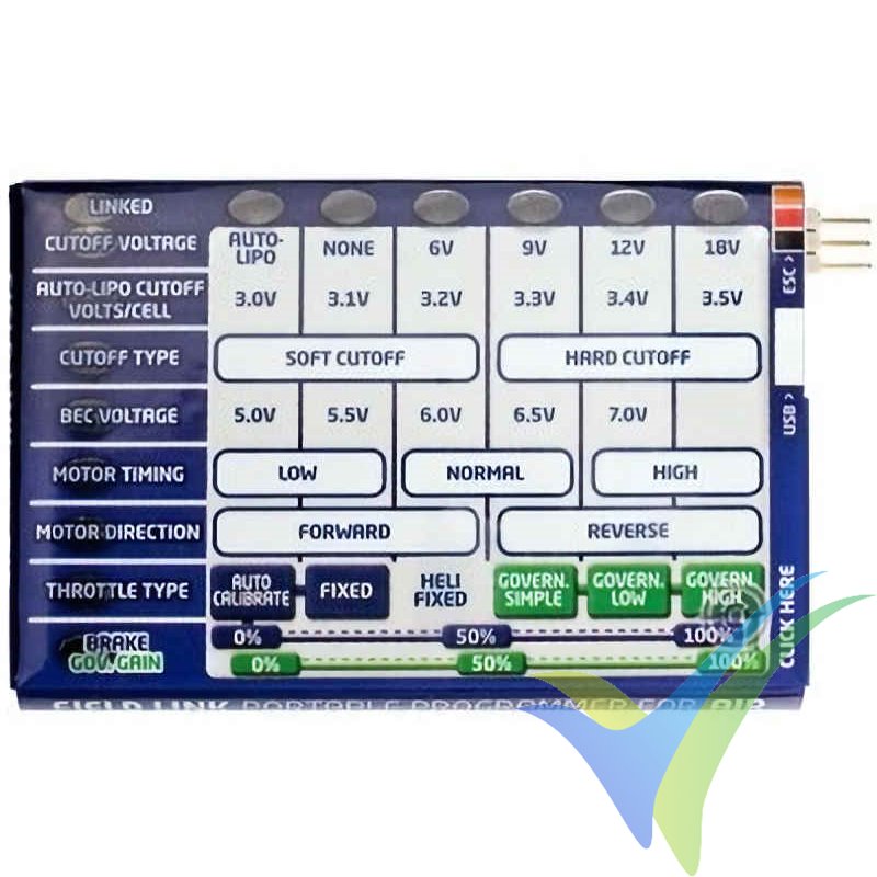 Tarjeta de programación para variadores Castle Creastions Talon, Phoenix Edge, Phoenix Edge HV, Thunderbird (limitaciones para Thunderbird), CC BEC & CC BEC PRO.